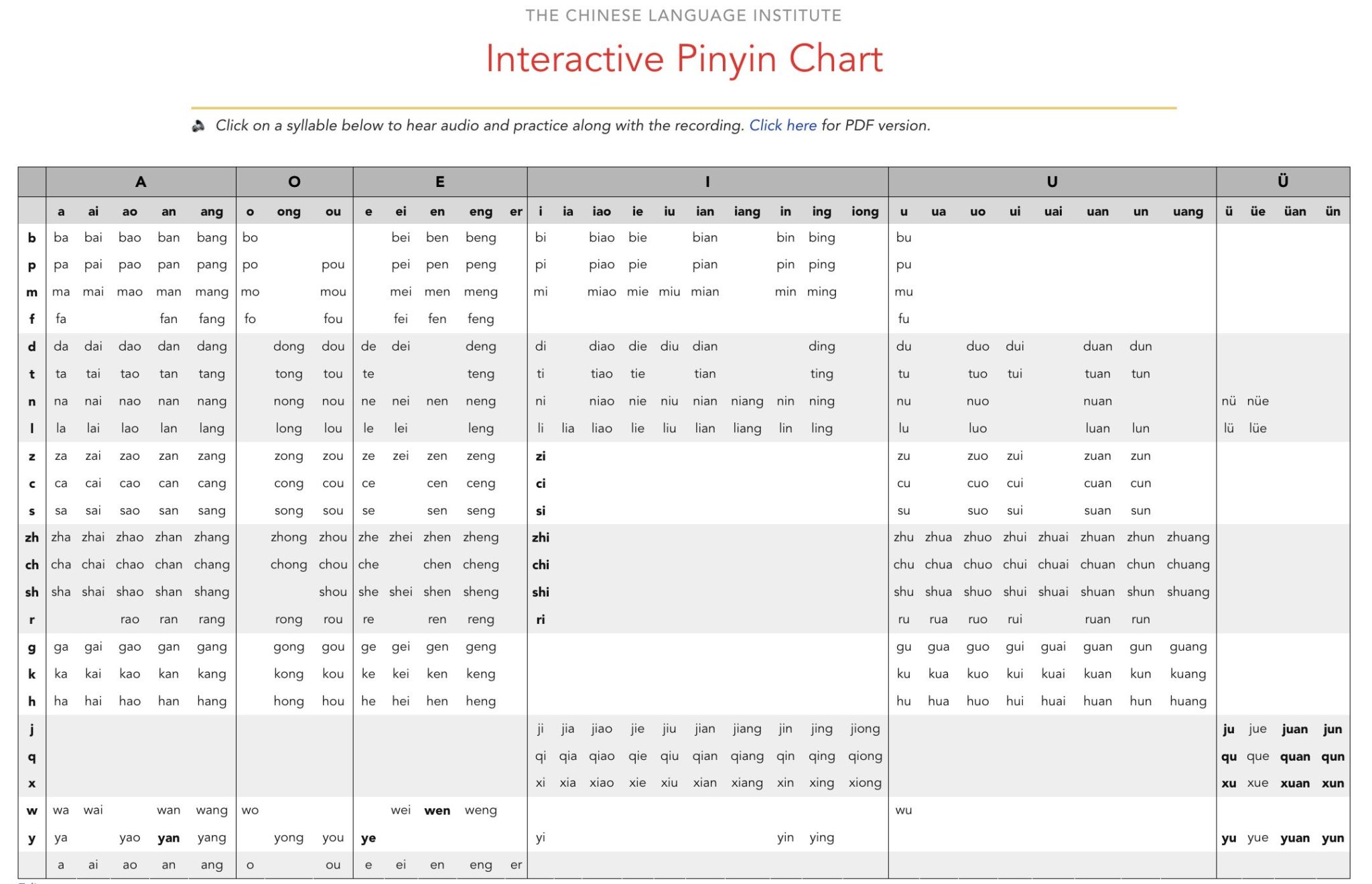 Pinyin helps learners connect Chinese characters with accurate pronunciation using the Latin alphabet. Check out CLI’s interactive pinyin chart to hear the sounds.