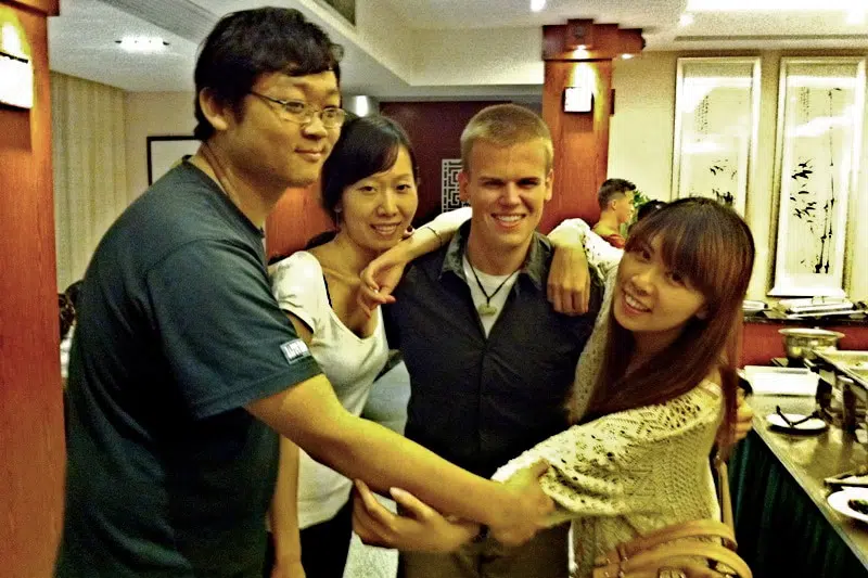 Jason spends an evening with his new Chinese friendsEarly during my time in Guilin I walked to a Buddhist monastery that is relatively close to the Chinese Language Institute (CLI) building. On the way to the building there are rows of small houses which look more like shacks than a house I would be accustomed to. While walking through this, I was struck by the sheer abjectness of the way people lived here. I realized that though I had seen poverty before in my life, it had never been with such a degree of starkness as I saw it here. After I passed this area, I came to the monastery where I spent nearly an hour talking with a monk. She freely gave her time over to explain the intricacies of Buddhist thought and the symbolism of the different objects and ornamentations in the monastery.